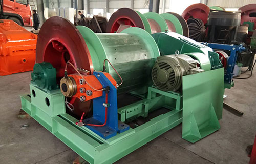 該提升絞車的主軸裝置有固定卷筒、活動卷筒(僅雙筒用)主軸、兩個軸承座、調繩機構(僅雙筒用)等部分組成,用來纏繞或釋放鋼絲繩。單筒提升絞車鋼絲繩為上出繩,雙筒提升絞車活動卷筒為下出繩,固定卷筒為上出繩,卷筒上裝有襯木。